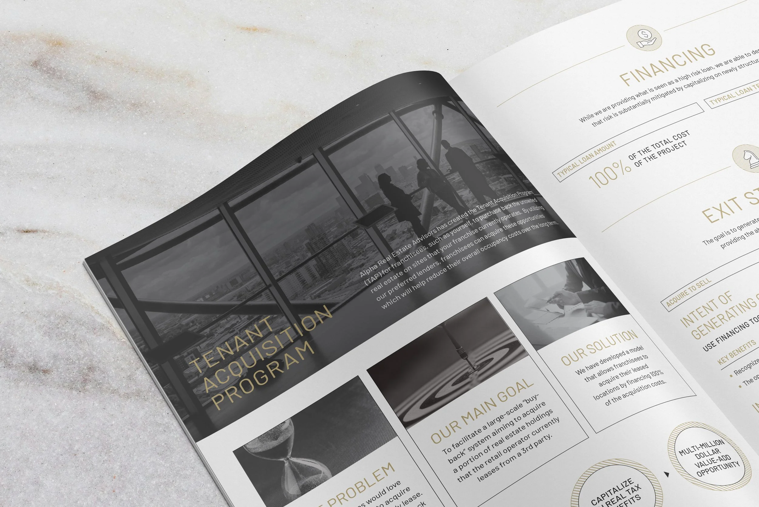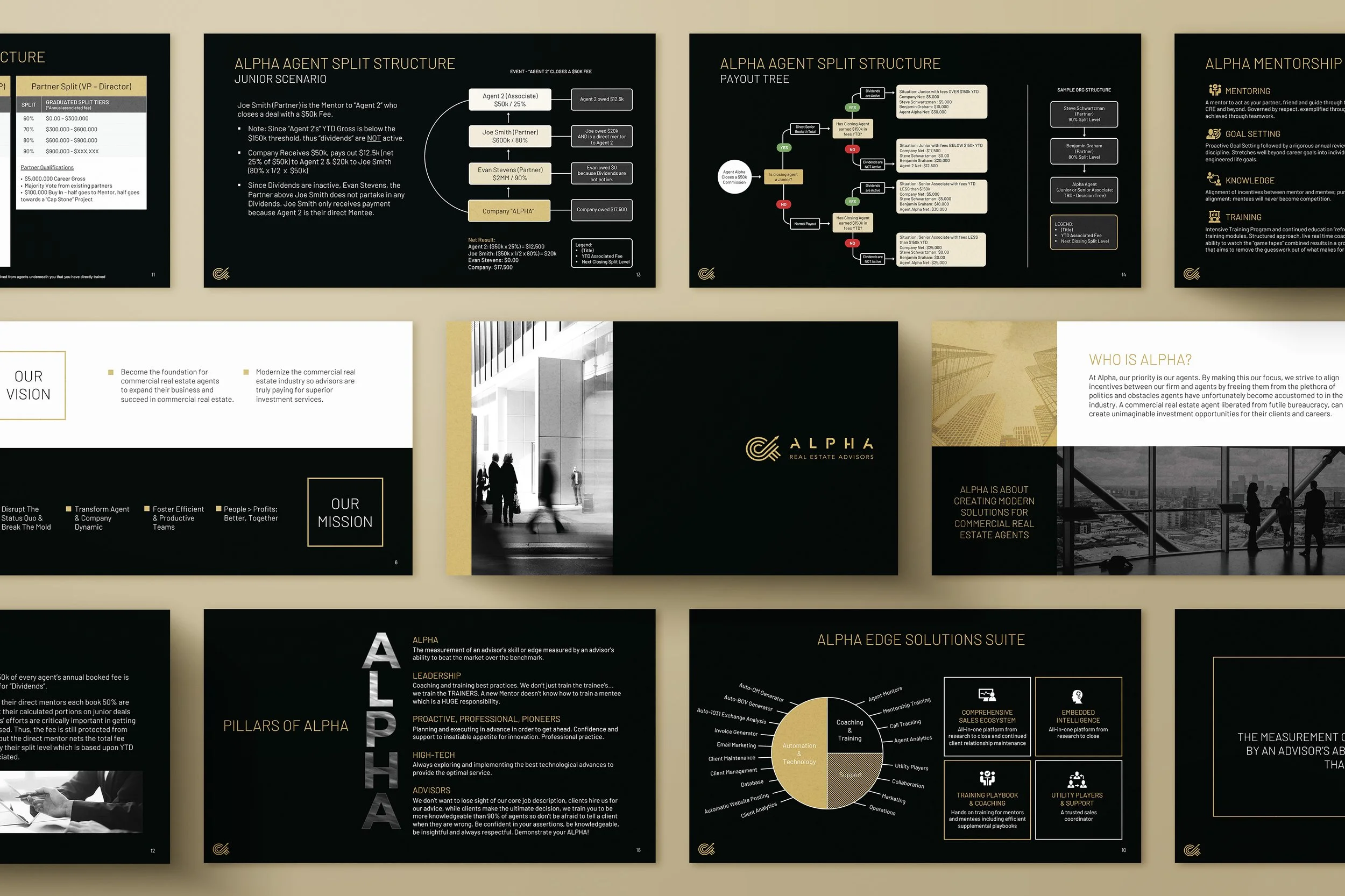A bold, modern brand system built on a foundation of black and gold—communicating luxury, precision, and confidence. The distinctive "Alpha" icon combines geometric forms suggesting forward movement and financial growth. I developed a complete visual language with custom patterns, structured typography hierarchy, and flexible application standards. The system extends across investor presentations, offering memorandums, agent recruitment booklets, pitch decks, broker opinion-of-value presentations, and trade-show marketing materials, ensuring a consistent, professional presentation at every client and prospect touchpoint.